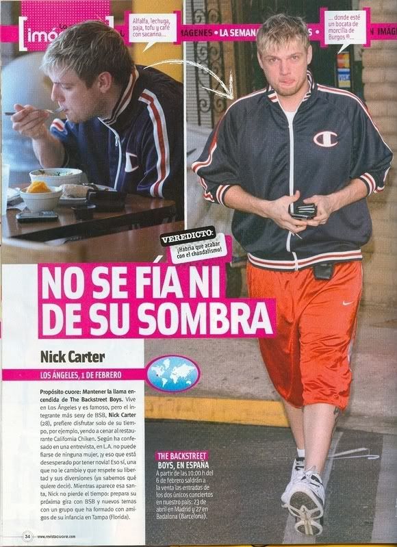 Ele vive em Los Angeles e é famoso, mas o integrante mais sexy do BSB, Nick Carter (28), prefere desfrutar de seu tempo sozinho. Por exemplo, indo jantar no restaurante Califórnia Chiken, como ele confessou em uma entrevista em LA. Não pode confiar em nenhuma mulher, e isso porque está desesperado para ter uma namorada! Isso sim, uma que não o troque e que respeite sua liberdade e suas diversões ( já sabemos o que ele quis dizer). Enquanto esta 'Santa' não aparece, Nick não perde tempo: prepara sua próxima turnê com os Backstreet Boys e novas musicas com um grupo que formou com amigos de infância em Tampa.( Flórida).